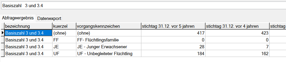 Die Auswertungen geben die Zahlen unterteilt nach Vorgangskennzeichen aus. Wenn Sie für dieses Feld in der Vorgangshauptmaske verschiedene Kennzeichen z.B. zur Kennzeichnung von UMA oder Geflüchteten festgelegt haben, zeigen die Auswertungen die Zahlen nach diesem Vorgangskennzeichen gruppiert an:
